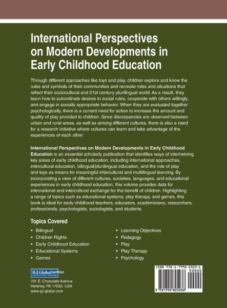Through different approaches like toys and play, children explore and know the rules and symbols of their communities and recreate roles and situations that reflect their sociocultural and 21st century plurilingual world. As a result, they learn how to subordinate desires to social rules, cooperate with others willingly, and engage in socially appropriate behavior. When they are evaluated together psychologically, there is a current need for action to increase the amount and quality of play provided to children. Since discrepancies are observed between urban and rural areas, as well as among different cultures, there is also a need for a research initiative where cultures can learn and take advantage of the experiences of each other. International Perspectives on Modern Developments in Early Childhood Education is an essential scholarly publication that identifies ways of intertwining key areas of early childhood education, including international approaches, intercultural education, bilingual/plurilingual education, and the role of play and toys as means for meaningful intercultural and multilingual learning. By incorporating a view of different cultures, societies, languages, and educational experiences in early childhood education, this volume provides data for international and intercultural exchange for the benefit of children. Highlighting a range of topics such as educational systems, play therapy, and games, this book is ideal for early childhood teachers, educators, academicians, researchers, professionals, psychologists, sociologists, and students.