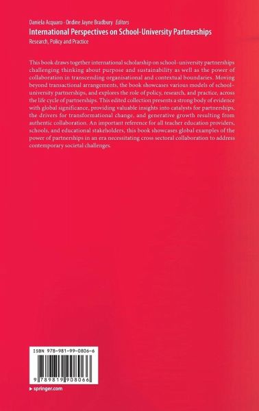 This book draws together international scholarship on school-university partnerships challenging thinking about purpose and sustainability as well as the power of collaboration in transcending organisational and contextual boundaries. Moving beyond transactional arrangements, the book showcase various models of school-university partnerships, and explores the role of policy, research, and practice, across the life cycle of partnerships. This edited collection presents a strong body of evidence with global significance, providing valuable insights into catalysts for partnerships, the drivers for transformational change, and generative growth resulting from authentic collaboration. An important reference for all teacher education providers, schools, and educational stakeholders, this book showcases global examples of the power of partnerships in an era necessitating cross sectoral collaboration to address contemporary societal challenges.