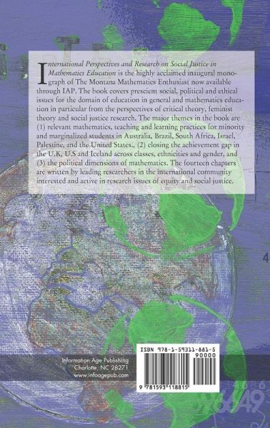 A Volume in The Montana Mathematics Enthusiast: Monograph Series in Mathematics Education Series Editor Bharath Sriraman, The University of Montana International Perspectives and Research on Social Justice in Mathematics Education is the highly acclaimed inaugural monograph of The Montana Mathematics Enthusiast now available through IAP. The book covers prescient social, political and ethical issues for the domain of education in general and mathematics education in particular from the perspectives of critical theory, feminist theory and social justice research. The major themes in the book are (1) relevant mathematics, teaching and learning practices for minority and marginalized students in Australia, Brazil, South Africa, Israel, Palestine, and the United States., (2) closing the achievement gap in the U.K, U.S and Iceland across classes, ethnicities and gender, and (3) the political dimensions of mathematics. The fourteen chapters are written by leading researchers in the international community interested and active in research issues of equity and social justice.