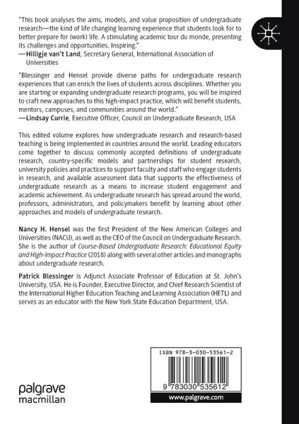 Chapter 1. Introduction and Overview.- Chapter 2. Undergraduate Research in the United States.- Chapter 3. Undergraduate Research in Australia.- Chapter 4. Undergraduate Research in Singapore.- Chapter 5. Gray Kochhar-Lindgren and Tracy Zou. Chapter 6. Undergraduate Research in Egypt.- Chapter 7. Undergraduate Research in Japan.- Chapter 8. Undergraduate Research in Kurdistan.- Chapter 9. Undergraduate Research in Brazil.- Chapter 10. Undergraduate Research in Ireland.- Chapter 11. Undergraduate Research in South Africa.- Chapter 12. Undergraduate Research in Germany.- Chapter 13. Undergraduate Research in Qatar.- Chapter 14. Undergraduate Research in France.- Chapter 15. Undergraduate Research in United Arab Emirates.- Chapter 16. Undergraduate Research in Portugal.- Chapter 17. Undergraduate Research in South Pacific.- Chapter 18. Undergraduate Research in Canada.- Chapter 19. Summary, Conclusions, and Recommendations.