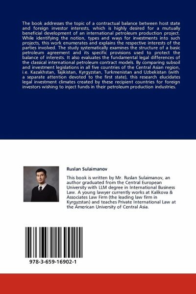 The book addresses the topic of a contractual balance between host state and foreign investor interests, which is highly desired for a mutually beneficial development of an international petroleum production project. While identifying the notion, types and ways for investments into such projects, this work enumerates and explains the respective interests of the parties involved. The study systematically examines the structure of a basic petroleum agreement and its specific provisions used to protect the balance of interests. It also evaluates the fundamental legal differences of the classical international petroleum contract models. By comparing subsoil and investment legislations in all five countries of the Central Asian region, i.e. Kazakhstan, Tajikistan, Kyrgyzstan, Turkmenistan and Uzbekistan (with a separate attention devoted to the first state), this research elucidates legal investment climates created by these recipient countries for foreign investors wishing to inject funds in their petroleum production industries.