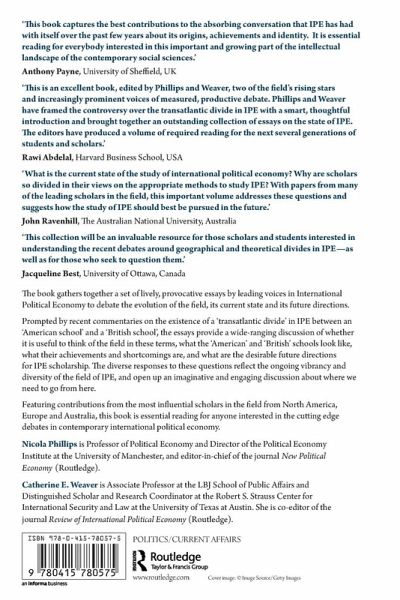 The book gathers together a set of lively, provocative essays by leading voices in International Political Economy to debate the evolution of the field, its current state and its future directions. Prompted by recent commentaries on the existence of a 'transatlantic divide' in IPE between an 'American school' and a 'British school', the essays provide a wide-ranging discussion of whether it is useful to think of the field in these terms, what the 'American' and 'British' schools look like, what their achievements and shortcomings are, and what are the desirable future directions for IPE scholarship. The diverse responses to these questions reflect the ongoing vibrancy and diversity of the field of IPE, and open up an imaginative and engaging discussion about where we need to go from here. Featuring contributions from the most influential scholars in the field from North America, Canada and the UK, this book is essential reading for anyone interested in the cutting edge debates in contemporary international political economy.