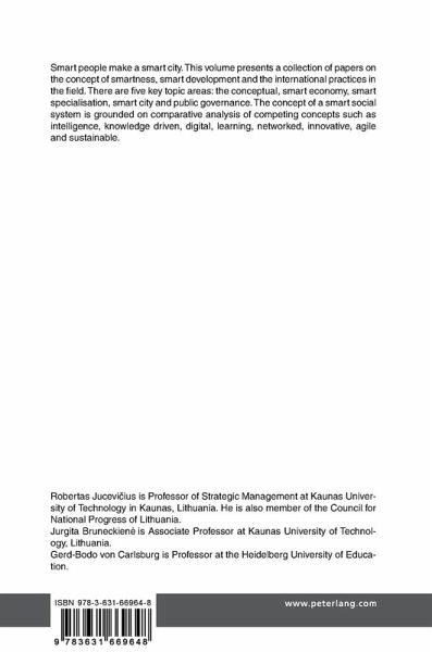 Smart people make a smart city. This volume presents a collection of papers on the concept of smartness, smart development and the international practices in the field. There are five key topic areas: the conceptual, smart economy, smart specialisation, smart city and public governance. The concept of a smart social system is grounded on comparative analysis of competing concepts such as intelligence, knowledge driven, digital, learning, networked, innovative, agile and sustainable.