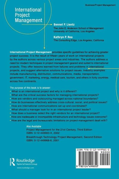'International Project Management' provides specific guidelines for achieving greater project success. It is the result of 15 years of work on international projects by the authors across various project areas and industries. The authors address a need for modern techniques in project management geared and suited to international projects. They offer lessons learned from failures and problems in international projects, and suggest alternative solutions for project issues. Industry examples include manufacturing, distribution, communications, media, transportation, government, IT, marketing, energy, medical care, tourism, and others in forty countries across five continents.
