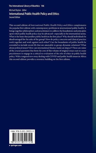 This second edition of International Public Health Policy and Ethics complements the popular first edition with contemporary problems in international public health. It brings together philosophers and practitioners to address the foundations and principles upon which public health policy may be advanced - especially in the international arena. What is the basis that justifies public health in the first place? Why should individuals be disadvantaged for the sake of the group? How do policy concerns and clinical practice work together and work against each other? Can the boundaries of public health be extended to include social ills that are amenable to group-dynamic solutions? What about political issues? How can international finance make an impact? These are some of the crucial questions that form the core of this volume of original essays sure to cause practitioners to engage in a critical re-evaluation of the role of ethics in public health policy. With a targeted new essay dealing with COVID and public health issues in Africa this second edition provides a resource building on the first edition.