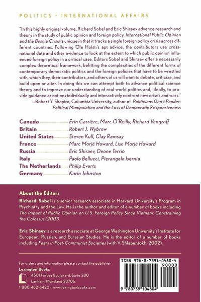 Part 1 Introduction Chapter 2 "In the Service of Peace": Reflexive Multilateralism and the Canadian Experience in Bosnia Chapter 3 British Attitudes toward the Bosnian Situation Chapter 4 U.S. Public Opinion on Intervention in Bosnia Chapter 5 Raison d'état or Raison populaire? The Influence of Public Opinion on France's Bosnia Policy Chapter 6 Russian Decision-making Regarding Bosnia: Indifferent Public and Feuding Elites Chapter 7 Massacring in Front of a Blind Audience? Italian Public Opinion and Bosnia Chapter 8 Innocence Lost: The Netherlands and the Yugoslav Crisis Chapter 9 German Public Opinion and the Crisis in Bosnia Part 10 Public Opinion and the Bosnia Crisis: A Conclusion