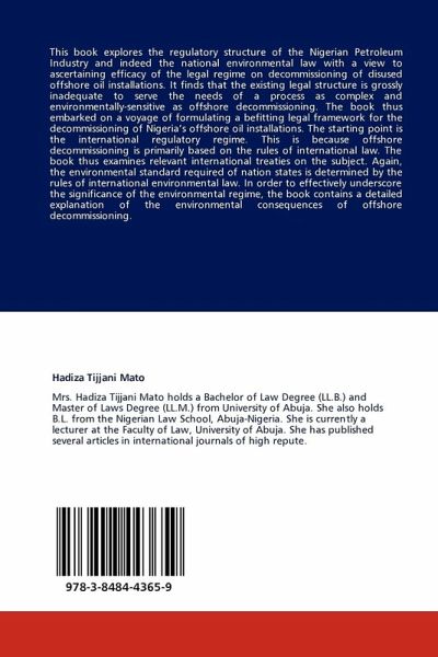 This book explores the regulatory structure of the Nigerian Petroleum Industry and indeed the national environmental law with a view to ascertaining efficacy of the legal regime on decommissioning of disused offshore oil installations. It finds that the existing legal structure is grossly inadequate to serve the needs of a process as complex and environmentally-sensitive as offshore decommissioning. The book thus embarked on a voyage of formulating a befitting legal framework for the decommissioning of Nigeria s offshore oil installations. The starting point is the international regulatory regime. This is because offshore decommissioning is primarily based on the rules of international law. The book thus examines relevant international treaties on the subject. Again, the environmental standard required of nation states is determined by the rules of international environmental law. In order to effectively underscore the significance of the environmental regime, the book contains adetailed explanation of the environmental consequences of offshore decommissioning.
