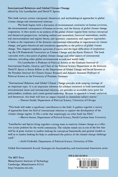 This book surveys current conceptual, theoretical, and methodological approaches to global climate change and international relations. Although it focuses on the role of states, it also examines the role of nonstate actors and international organizations whenever state-centric explanations are insufficient.The book begins with a discussion of environmental constraints on human activities, the environmental consequences of human activities, and the history of global climate change cooperation. It then moves to an analysis of the global climate regime from various conceptual and theoretical perspectives. These include realism and neorealism, historical materialism, neoliberal institutionalism and regime theory, and epistemic community and cognitive approaches. Stressing the role of nonstate actors, the book looks at the importance of the domestic-international relationship in negotiations on climate change. It then looks at game-theoretical and simulation approaches to the politics of global climate change. It emphasizes questions of equity and the legal difficulties of implementing the UN Framework Convention on Climate Change and the Kyoto Protocol. It concludes with a discussion of global climate change and other aspects of international relations, including other global environmental accords and world trade. The book also contains Internet references to major relevant documents.