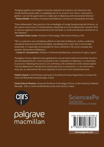This volume explores the interrelation of international relations, music, and diplomacy from a multidisciplinary perspective. Throughout history, diplomats have gathered for musical events, and musicians have served as national representatives. Whatever political unit is under consideration (city-states, empires, nation-states), music has proven to be a component of diplomacy, its ceremonies, and its strategies. Following the recent acoustic turn in IR theory, the authors explore the notion of "musical diplomacies" and ask whether and how it differs from other types of cultural diplomacy. Accordingly, sounds and voices are dealt with in acoustic terms but are not restricted to music per se, also taking into consideration the voices (speech) of musicians in the international arena.