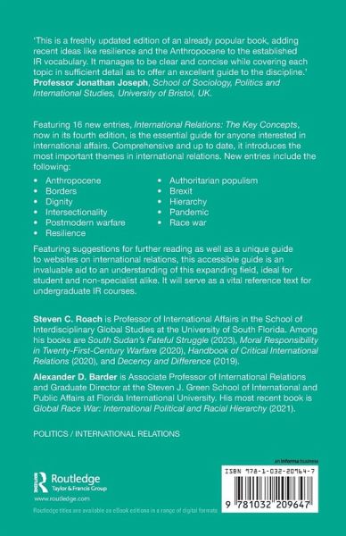 Preface, List of Key Concepts, Introduction, AFRICAN UNION: Alliance, Anarchy, Anthropocene, Appeasement, Arab League, Arab Spring, Arms control, Arms trade, Authoritarian populism, BALANCE OF POWER: Borders, Bretton Woods, Brexit, Bush Doctrine, CAPITAL CONTROLS: Capitalism, Citizenship, Clash of civilisations, Climate change, Coercion, Cold war, Collective security, Communism, Communitarianism, Concert of powers, Constructivism, Containment, Cosmopolitanism, Crisis, Critical theory, DEBT TRAP: Decolonisation, Democratic peace, Democratisation, Dependency, Deterrence, Development, Diaspora, Digital divide, Dignity, Diplomacy, Disarmament, EMBEDDED LIBERALISM: Emotions, End of history, Enemy combatant, English School, Ethnic cleansing, Ethnicity, Euro, European Union (EU), Exploitation, Extraterritoriality, FAILED STATE: Feminism, Foreign aid, Foreign direct investment (FDI), Free trade, Functionalism, GENDER: Genocide, Geopolitics, Global civil society, Global financial crisis, Global governance, Global justice, Global South, Globalisation, Governmentality, Great powers, Group of twenty (G-20), HEGEMONIC STABILITY THEORY: Hegemony, Hierarchy, Historical sociology, Human rights, Human security, Humanitarian intervention, IDEALISM: Imperialism, Integration, Interdependence, International Criminal Court (ICC), International criminal tribunals, International law, International Monetary Fund (IMF), International political economy, Intersectionality, International society, Irredentism, Isolationism, JIHAD: Just war, LEAGUE OF NATIONS: Legitimacy, Levels of analysis, Liberal internationalism, Loose nukes, MANAGED TRADE: Marxism, Mercantilism, Mercenary, Mercosur, Misperception, Modernisation theory, Multilateralism, Multinational corporation (MNC), Mutually assured destruction (MAD), NATION STATE: National interest, Nationalism, Neoliberalism, Newly industrialising countries (NICs), Non-governmental organisation (NGO), Non-tariff barrier (NTB), North Atlantic Treaty Organization (NATO), Nuclear proliferation, ORDER: Organisation for Economic Cooperation and Development (OECD), Organization for Security and Cooperation in Europe (OSCE), Organization of the Petroleum Exporting Countries (OPEC), PANDEMIC: Peace-building, Peacekeeping, Peace of Westphalia, Peace studies, Political risk, Population growth, Postcolonialism, Postmodern warfare, Postmodernism, Power, Practice turn, Pre-emption, Preventive diplomacy, Prisoners' dilemma, Public goods, QUEER THEORY, RACE WAR: Realism, Reciprocity, Recognition, Refugees, Regime, Regional trade blocs, Regionalism, Relative gains/absolute gains, Resilience, Responsibility to protect (R2P), Rogue state, SAFE HAVEN: Sanctions, Secession, Security, Security dilemma, Self-determination, Sovereignty, Structural adjustment programme (SAP), Structural violence, Superpower, Sustainable development, TERRORISM: Theory, Torture, Tragedy of the commons, UNILATERALISM: , United Nations (UN), WAR: War crime, War on terror, Women in development (WID), World Bank, World-system theory, World Trade Organization (WTO), Appendix, Bibliography, Index.