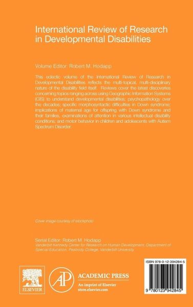 International Review of Research in Developmental Disabilities is an ongoing scholarly look at research into the causes, effects, classification systems, syndromes, etc. of developmental disabilities. Contributors come from wide-ranging perspectives, including genetics, psychology, education, and other health and behavioral sciences.