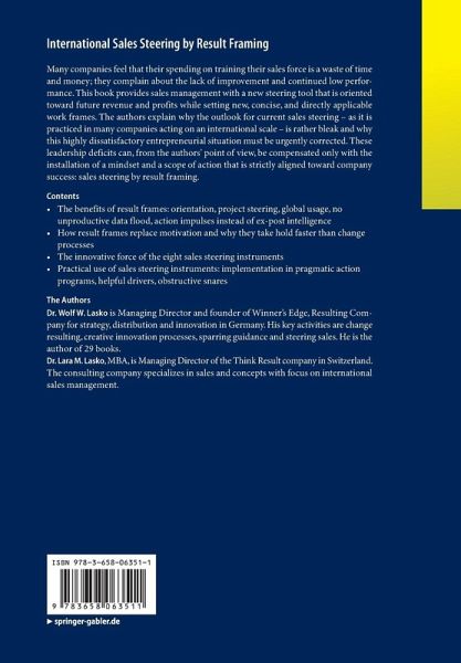 This book provides sales management with a new steering tool that is oriented toward future revenue and profits while setting new, concise, and directly applicable work frames. These work frames are necessary because many companies feel that their spending on training their sales force is a waste of time and money; they complain about the lack of improvement and continued low performance. The authors explain why the outlook for current sales steering - as it is practiced in many companies acting on an international scale - is rather bleak and why this highly dissatisfactory entrepreneurial situation must be urgently corrected. These leadership deficits can, from the authors' point of view, be compensated only with the installation of a mindset and a scope of action that is strictly aligned toward company success: sales steering by result framing.