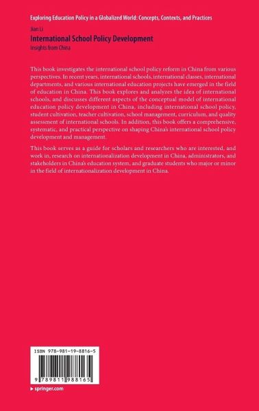 The international school policy development in China.- International school student cultivation g in China.- The teacher cultivation of international schools in China.- International school management in China.- International school curriculum in China.- Quality assessment of international schools in China.