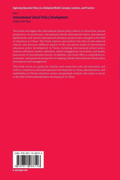 The international school policy development in China.- International school student cultivation g in China.- The teacher cultivation of international schools in China.- International school management in China.- International school curriculum in China.- Quality assessment of international schools in China.