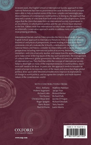 Sixteen leading scholars from three continents critically evaluate the School's contribution to the study of international theory and history; consider its relationship with a variety of alternative perspectives including international political economy, feminism, environmentalism, and critical security studies; and assess how the approach can help us to make sense of the big issues of the day such as terrorism, the management of cultural difference, global governance, the ethics of coercion, and the role of international law. They find that whilst the concept of international society helps to shed light on many of the important tensions in world politics, much work still needs to be done. In particular, the approach needs to broaden its empirical scope to incorporate more of the issues and actors that shape global politics; draw upon other theoretical traditions to improve its explanations of change in world politics; and recognize the complex and multi-layered nature of the contemporary world.