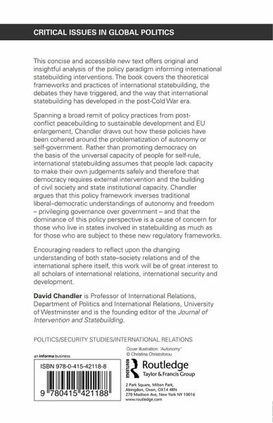 This concise and accessible new text offers original and insightful analysis of the policy paradigm informing international statebuilding interventions. The book covers the theoretical frameworks and practices of international statebuilding, the debates they have triggered, and the way that international statebuilding has developed in the post-Cold War era. Spanning a broad remit of policy practices from post-conflict peacebuilding to sustainable development and EU enlargement, Chandler draws out how these policies have been cohered around the problematization of autonomy or self-government. Rather than promoting democracy on the basis of the universal capacity of people for self-rule, international statebuilding assumes that people lack capacity to make their own judgements safely and therefore that democracy requires external intervention and the building of civil society and state institutional capacity. Chandler argues that this policy framework inverses traditional liberal-democratic understandings of autonomy and freedom - privileging governance over government - and that the dominance of this policy perspective is a cause of concern for those who live in states involved in statebuilding as much as for those who are subject to these new regulatory frameworks. Encouraging readers to reflect upon the changing understanding of both state-society relations and of the international sphere itself, this work will be of great interest to all scholars of international relations, international security and development.