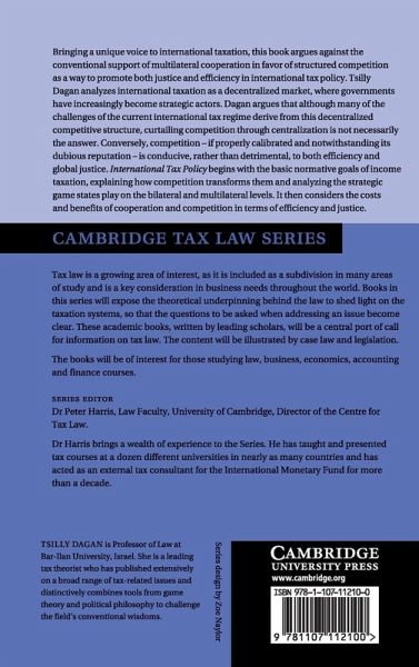 Bringing a unique voice to international taxation, this book argues against the conventional support of multilateral co-operation in favour of structured competition as a way to promote both justice and efficiency in international tax policy. Tsilly Dagan analyzes international taxation as a decentralized market, where governments have increasingly become strategic actors. While many of the challenges of the current international tax regime derive from this decentralized competitive structure, Dagan argues that curtailing competition through centralization is not necessarily the answer. Conversely, competition - if properly calibrated and notwithstanding its dubious reputation - is conducive, rather than detrimental, to both efficiency and global justice. International Tax Policy begins with the basic normative goals of income taxation, explaining how competition transforms them and analyzing the strategic game states play on the bilateral and multilateral level. It then considers the costs and benefits of co-operation and competition in terms of efficiency and justice.