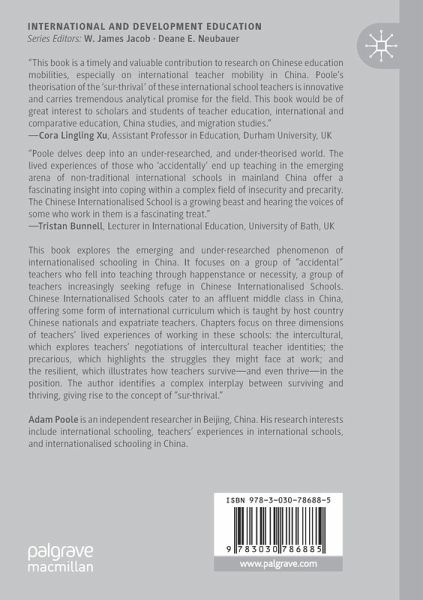 This book explores the emerging and under-researched phenomenon of internationalised schooling in China. It focuses on a group of "accidental" teachers who fell into teaching through happenstance or necessity, a group of teachers increasingly seeking refuge in Chinese Internationalised Schools. Chinese Internationalised Schools cater to an affluent middle class in China, offering some form of international curriculum which is taught by host country Chinese nationals and expatriate teachers. Chapters focus on three dimensions of teachers' lived experiences of working in these schools: the intercultural, which explores teachers' negotiations of intercultural teacher identities; the precarious, which highlights the struggles they might face at work; and the resilient, which illustrates how teachers survive-and even thrive-in the position. The author identifies a complex interplay between surviving and thriving, giving rise to the concept of "sur-thrival."