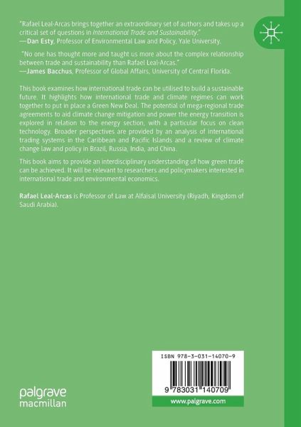 This book examines how international trade can be utilised to build a sustainable future. It highlights how international trade and climate regimes can work together to put in place a Green New Deal. The potential of mega-regional trade agreements to aid climate change mitigation and power the energy transition is explored in relation to the energy section, with a particular focus on clean technology. Broader perspectives are provided by an analysis of international trading systems in the Caribbean and Pacific Islands and a review of climate change law and policy in Brazil, Russia, India, and China.