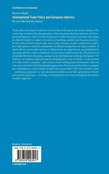 Trade policy has played a vital role in the decline of European electronics business. The events that resulted in the disappearance of the European television industry, of a European and Japanese video recorder format and of other European consumer electronics are directly related to market structures in exporting countries and business practices. In this book, factual business data shows and economic models explain how restrictive trade practices result in elimination of efficient competitors in export markets. It deals with the memorable case how a videocassette recorder format was established by dumping and how politics enabled it. An innovative tariff increase for CD players was invalidated by heavy dumping, causing closure of production in Europe. European CTV industry succumbed under permanent dumping and a series of biases - as the interest of a state-owned company - and serious errors making trade instruments void and rules irreconcilable with international agreements. Practical and theoretical examples and explanations, some in detail, of trade rules are provided. The book sketches events - carelessness, prejudice or special interests, arbitrary and false application of trade instruments and fraud - resulting in disappearance of various European electronics business segments.