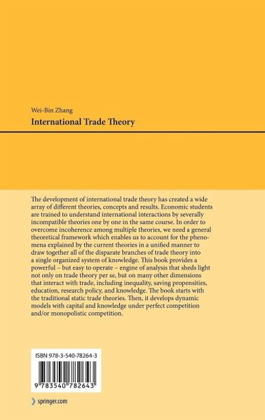 The development of international trade theory has created a wide array of different theories, concepts and results. Nevertheless, trade theory has been split between partial and conflicting representations of international e- nomic interactions. Diverse trade models have co-existed but not in a structured relationship with each other. Economic students are introduced to international economic interactions with severally incompatible theories in the same course. In order to overcome incoherence among multiple theories, we need a general theoretical framework in a unified manner to draw together all of the disparate branches of trade theory into a single - ganized system of knowledge. This book provides a powerful - but easy to operate - engine of analysis that sheds light not only on trade theory per se, but on many other dim- sions that interact with trade, including inequality, saving propensities, education, research policy, and knowledge. Building and analyzing various tractable and flexible models within a compact whole, the book helps the reader to visualize economic life as an endless succession of physical ca- tal accumulation, human capital accumulation, innovation wrought by competition, monopoly and government intervention. The book starts with the traditional static trade theories. Then, it develops dynamic models with capital and knowledge under perfect competition and/or monopolistic competition. The uniqueness of the book is about modeling trade dyn- ics.