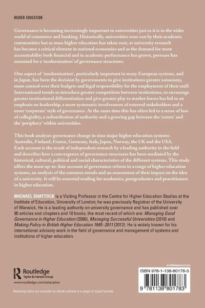 Governance is becoming increasingly important in universities just as it is in the wider world of commerce and banking. Historically, universities were run by their academic communities but as mass higher education has taken root, as university research has become a critical element in national economies and as the demand for more accountability both financial and in academic performance has grown, pressure has mounted for a 'modernisation' of governance structures. One aspect of 'modernisation', particularly important in many European systems, and in Japan, has been the decision by governments to give institutions greater autonomy, more control over their budgets and legal responsibility for the employment of their staff. International trends to introduce greater competition between institutions, to encourage greater institutional differentiation and give greater play to market forces has led to an emphasis on leadership, a more systematic involvement of external stakeholders and a more 'corporate style of governance. At the same time this has often led to a sense of loss of collegiality, a redistribution of authority and a growing gap between the 'centre' and the 'periphery' within universities. This book analyses governance change in nine major higher education systems, Australia, Finland, France, Germany, Italy, Japan, Norway, the UK and the USA, each account being the result of independent research by a leading authority in the field and describes how a convergence of governance structures has been mediated by the historical, cultural, political and social characteristics of the different systems. Michael Shattock is a leading authority on university governance; this study offers the most up to date account of governance reform in a range of higher education systems, an analysis of the common trends and an assessment of their impact on the idea of a university. It will be essential reading for academics, postgraduates and practitioners in higher education.