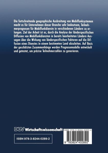 Die fortschreitende geographische Ausbreitung von Mobilfunksystemen macht es für Unternehmen dieser Branche sehr bedeutsam, Teilnehmerprognosen für Mobilfunkdienste in verschiedenen Ländern zu erlangen. Ziel der Arbeit ist es, durch die Analyse der länderspezifischen Diffusion von Mobilfunkdiensten in bereits bearbeiteten Ländern Aussagen über die Wirkung von länderspezifischen Faktoren auf die Diffusion eines Dienstes in einem bestimmten Land abzuleiten. Auf Basis der geschätzten Zusammenhänge werden Prognosemodelle entwickelt und getestet, um präzise Teilnehmerzahlen zu generieren.