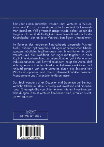 Im Rahmen der modernen Finanztheorie untersucht Michael Fröhls anhand optionspreis- und agenturtheoretischer Überlegungen mögliche Implikationen von Investitionen in Joint Ventures auf die Wohlfahrt der Eigenkapitalgeber.