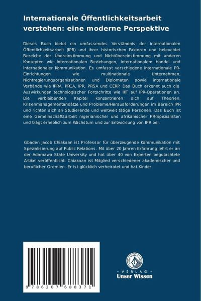 Dieses Buch bietet ein umfassendes Verständnis der internationalen Öffentlichkeitsarbeit (IPR) und ihrer historischen Faktoren und beleuchtet Bereiche der Übereinstimmung und Nichtübereinstimmung mit anderen Konzepten wie internationalen Beziehungen, internationalem Handel und internationaler Kommunikation. Es umfasst verschiedene internationale PR-Einrichtungen wie multinationale Unternehmen, Nichtregierungsorganisationen und Diplomaten sowie internationale Verbände wie IPRA, PRCA, IPR, PRSA und CERP. Das Buch erkennt auch die Auswirkungen technologischer Fortschritte wie IKT auf IPR-Operationen an. Die verbleibenden Kapitel konzentrieren sich auf Theorien, Krisenmanagementansätze und Probleme/Herausforderungen im Bereich IPR und richten sich an Studierende und weltweit tätige Personen. Das Buch ist eine Gemeinschaftsarbeit nigerianischer und afrikanischer PR-Spezialisten und trägt erheblich zum Wachstum und zur Entwicklung von IPR bei.