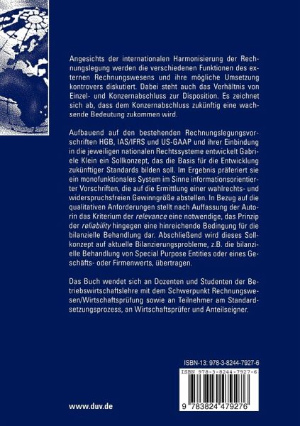 Aufbauend auf den bestehenden Rechnungslegungsvorschriften HGB, IAS/IFRS und US-GAAP und ihrer Einbindung in die jeweiligen nationalen Rechtssysteme entwickelt Gabriele Klein ein Sollkonzept, das die Basis für die Entwicklung zukünftiger Standards bilden soll. Im Ergebnis präferiert sie ein monofunktionales System im Sinne informationsorientierter Vorschriften, die auf die Ermittlung einer wahlrechts- und widerspruchsfreien Gewinngröße abstellen. In Bezug auf die qualitativen Anforderungen stellt nach Auffassung der Autorin das Kriterium der relevance eine notwendige, das Prinzip der reliability hingegen eine hinreichende Bedingung für die bilanzielle Behandlung dar. Abschließend wird dieses Sollkonzept auf aktuelle Bilanzierungsprobleme, z.B. die bilanzielle Behandlung von Special Purpose Entities oder eines Geschäfts- oder Firmenwerts, übertragen.
