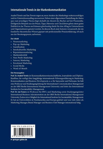 SCOAP als Bedürfnistheorie für das Neuromarketing.- Die Erfolgsfaktoren von Pop-up-Stores.- Gamification.- Interkulturelles Marketing durch Dialektik.- Reputationsmarketing.-Markenidentität durch wertorientierte Mitarbeiterkommunikation.-Nonprofit-Marketing.- Sensory Marketing.- The Impact of Emotions in Marketing Strategy.- Using Social Media for Business - Tools, Benefits and Pitfalls.- Word-of-Mouth-Marketing - Die geheime Macht des Wortes.