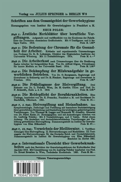 Allgemeines.- Folgen des Krieges, der verschlechterten Ernährung, der Überarbeit für den allgemeinen Gesundheitszustand der Arbeiter und besonders der Arbeiterinnen.- Blei.- Quecksilber.- Andere Metalle.- Arsen.- Phosphor.- Sehwefelwasserstoif.- Chlor, Salzsäure.- Schwefelige und Schwefelsäure.- Nitrose Gase.- Kohlenoxyd, Rauchgase, Kohlensaure, Kohlendunst.- Schwefelkohlenstoff.- Gechlorte und andere Verbindungen der Fettreihe, Anstrich von Flugzeugen.- Benzin, Petroleum.- Benzol nnd Benzolderivate.- Benzolderivate in der Munitionsindustrie..- Kampfgase.- Terpentin.- Verschiedene Gifte.- Milzbrand.- Verschiedene Infektionen.- Staub.- Ungeeignete Arbeitsräume, extreme Temperaturen, übermäßige Muskelanstrengung, Erkrankungen durch mechanische Ursachen.- Hautkrankheiten.- Augenerkrankungen.- Wirkungen des elektrischen Stromes.- Verschiedenes.- England.- 1916 (Bericht des Munitionsarbeiter-Gesundheitskomitees an den Munitionsminister betreffend Gewerbekrankheiten in der Munitionsindustrie).