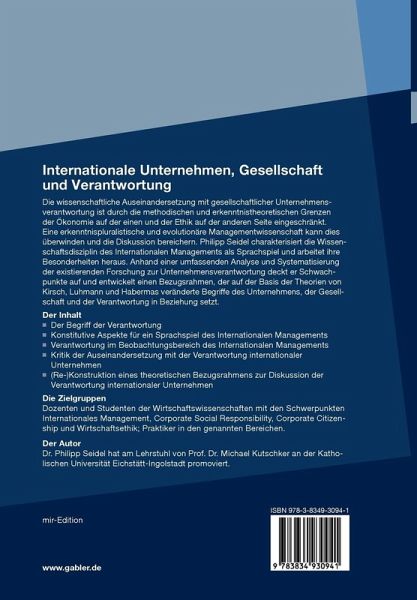 Philipp Seidel charakterisiert die Wissenschaftsdisziplin des Internationalen Managements als Sprachspiel und arbeitet ihre Besonderheiten heraus. Anhand einer umfassende Analyse und Systematisierung der existierenden Forschung zur Unternehmensverantwortung deckt er Schwachpunkte auf und entwickelt einen Bezugsrahmen, der auf der Basis der Theorien von Kirsch, Luhmann und Habermas veränderte Begriffe des Unternehmens, der Gesellschaft und der Verantwortung in Beziehung setzt.