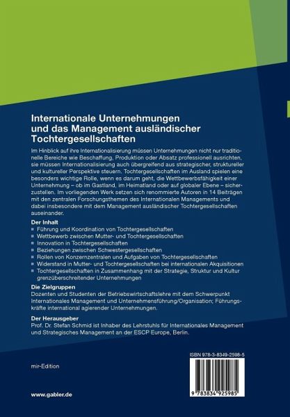 Im Hinblick auf ihre Internationalisierung müssen Unternehmen nicht nur traditionelle Bereiche wie Beschaffung, Produktion oder Absatz professionell ausrichten, sie müssen Internationalisierung auch übergreifend aus strategischer, struktureller und kultureller Perspektive steuern. Tochtergesellschaften im Ausland spielen eine wichtige Rolle, wenn es darum geht, die Wettbewerbsfähigkeit einer Unternehmung - ob im Gastland, im Heimatland oder auf globaler Ebene - sicherzustellen. In 14 Beiträgen setzen sich renommierte Autoren mit den Entwicklungen und Herausforderungen von ausländischen Tochtergesellschaften sowie anderen zentralen Themenfeldern des Internationalen Managements auseinander.