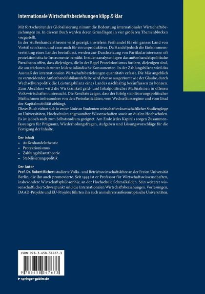 Mit fortschreitender Globalisierung nimmt die Bedeutung internationaler Wirtschaftsbeziehungen zu. In diesem Buch werden deren Grundlagen in vier größeren Themenblöcken vorgestellt. In der Außenhandelstheorie wird gezeigt, inwiefern Freihandel für ein ganzes Land von Vorteil sein kann, und zwar auch für ein unproduktives. Da Handel jedoch die Einkommensverteilung eines Landes beeinflusst, werden zur Durchsetzung von Partikularinteressen oft protektionistische Instrumente bemüht. Inzidenzanalysen legen das außenhandelspolitische Paradoxon offen, dass diejenigen, die in der Regel Protektionismus fordern, diejenigen sind, die am stärksten darunter leiden: inländische Konsumenten. In der Zahlungsbilanz wird das Ausmaß der internationalen Wirtschaftsbeziehungen quantitativ erfasst. Die Mär angeblich zu vermeidender Außenhandelsbilanzdefizite wird ebenso ausgeräumt wie der Glaube, durch Wechselkurspolitik die Leistungsbilanz eines Landes nachhaltig beeinflussen zu können. Zum Abschlusswird die Wirksamkeit geld- und fiskalpolitischer Maßnahmen in offenen Volkswirtschaften untersucht. Die Resultate zeigen, dass der Erfolg stabilisierungspolitischer Maßnahmen insbesondere von den Preiselastizitäten, vom Wechselkursregime und vom Grad der Kapitalmobilität abhängt.Dieses Buch richtet sich in erster Linie an Studenten wirtschaftswissenschaftlicher Studiengänge an Universitäten, Hochschulen angewandter Wissenschaften sowie an dualen Hochschulen. Es ist jedoch auch zum Selbststudium geeignet. Am Ende jedes Kapitels sorgen Zusammenfassungen für Prägnanz, Wiederholungsfragen, Aufgaben und Lösungsvorschläge für die Festigung der Inhalte.