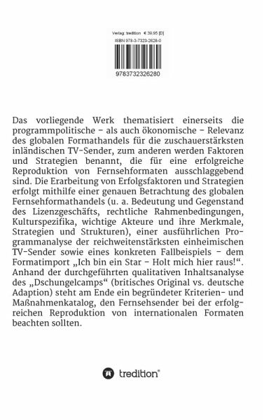 Das vorliegende Werk thematisiert einerseits die programmpolitische als auch ökonomische Relevanz des globalen Formathandels für die zuschauerstärksten inländischen TV-Sender, zum anderen werden Faktoren und Strategien benannt, die für eine erfolgreiche Reproduktion von Fernsehformaten ausschlaggebend sind. Die Erarbeitung von Erfolgsfaktoren und Strategien erfolgt mithilfe einer genauen Betrachtung des globalen Fernsehformathandels (u. a. Bedeutung und Gegenstand des Lizenzgeschäfts, rechtliche Rahmenbedingungen, Kulturspezifika, wichtige Akteure und ihre Merkmale, Strategien und Strukturen), einer ausführlichen Programmanalyse der reichweitenstärksten einheimischen TV-Sender sowie eines konkreten Fallbeispiels dem Formatimport Ich bin ein Star Holt mich hier raus! . Anhand der durchgeführten qualitativen Inhaltsanalyse des Dschungelcamps (britisches Original vs. deutsche Adaption) steht am Ende ein begründeter Kriterien- und Maßnahmenkatalog, den Fernsehsender bei der erfolgreichen Reproduktion von internationalen Formaten beachten sollten.