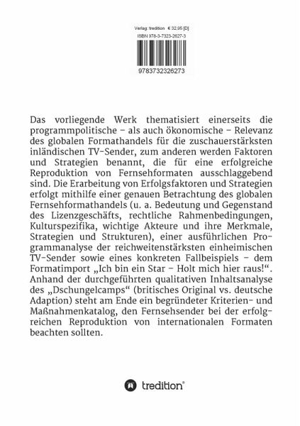 Das vorliegende Werk thematisiert einerseits die programmpolitische als auch ökonomische Relevanz des globalen Formathandels für die zuschauerstärksten inländischen TV-Sender, zum anderen werden Faktoren und Strategien benannt, die für eine erfolgreiche Reproduktion von Fernsehformaten ausschlaggebend sind. Die Erarbeitung von Erfolgsfaktoren und Strategien erfolgt mithilfe einer genauen Betrachtung des globalen Fernsehformathandels (u. a. Bedeutung und Gegenstand des Lizenzgeschäfts, rechtliche Rahmenbedingungen, Kulturspezifika, wichtige Akteure und ihre Merkmale, Strategien und Strukturen), einer ausführlichen Programmanalyse der reichweitenstärksten einheimischen TV-Sender sowie eines konkreten Fallbeispiels dem Formatimport Ich bin ein Star Holt mich hier raus! . Anhand der durchgeführten qualitativen Inhaltsanalyse des Dschungelcamps (britisches Original vs. deutsche Adaption) steht am Ende ein begründeter Kriterien- und Maßnahmenkatalog, den Fernsehsender bei der erfolgreichen Reproduktion von internationalen Formaten beachten sollten.