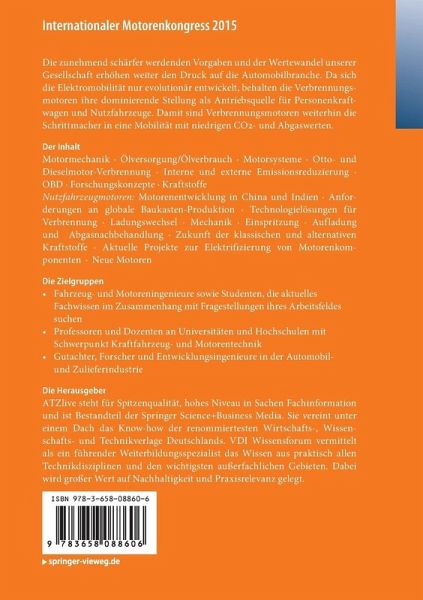 Motormechanik.- Ölversorgung/Ölverbrauch.- Motorsysteme.- Otto- und Dieselmotor-Verbrennung.- Interne und externe Emissionsreduzierung.- OBD.- Forschungskonzepte.- Kraftstoffe. Nutzfahrzeugmotoren: Motorenentwicklung in China und Indien - Anforderungen an globale Baukasten-Produktion.- Technologielösungen für Verbrennung - Ladungswechsel - Mechanik - Einspritzung - Aufladung und Abgasnachbehandlung.- Zukunft der klassischen und alternativen Kraftstoffe.- Aktuelle Projekte zur Elektrifizierung von Motorenkomponenten.- Neue Motoren.