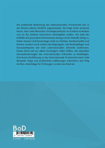 Die praktische Bedeutung des Internationalen Privatrechts hat in den letzten Jahren deutlich zugenommen. Das liegt unter anderem daran, dass viele Menschen Vermögensstände im Ausland erwerben und an die nächste Generation weitergeben wollen. Die Zahl der Erbfälle mit grenzüberschreitendem Bezug nimmt deshalb stetig zu. Daher müssen sich heutzutage nicht nur Richter, Rechtsanwälte und Notare, sondern auch andere Berufsgruppen, wie Rechtspfleger und Konsularbeamte mit dem internationalen Erbrecht auskennen. Dieses Buch soll vor allem Einsteigern dabei helfen, die speziellen Herausforderungen des internationalen Erbrechts zu bewältigen. Eine kurze Einführung in das Internationale Privatrecht sowie viele Beispiele, Tipps und auführliche Falllösungen erleichtern den Weg dorthin. Ratschläge für Prüfungen runden das Buch ab.