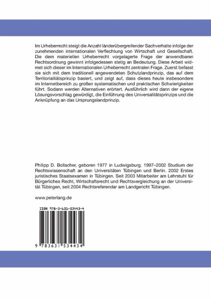 Im Urheberrecht steigt die Anzahl länderübergreifender Sachverhalte infolge der zunehmenden internationalen Verflechtung von Wirtschaft und Gesellschaft. Die dem materiellen Urheberrecht vorgelagerte Frage der anwendbaren Rechtsordnung gewinnt infolgedessen stetig an Bedeutung. Diese Arbeit widmet sich dieser im Internationalen Urheberrecht zentralen Frage. Zuerst befasst sie sich mit dem traditionell angewendeten Schutzlandprinzip, das auf dem Territorialitätsprinzip basiert, und zeigt auf, dass dieses heute insbesondere im Internetbereich zu großen systematischen und praktischen Schwierigkeiten führt. Sodann werden Alternativen erörtert. Ausführlich wird dann der eigene Lösungsvorschlag gewürdigt, die Einführung des Universalitätsprinzips und die Anknüpfung an das Ursprungslandprinzip.