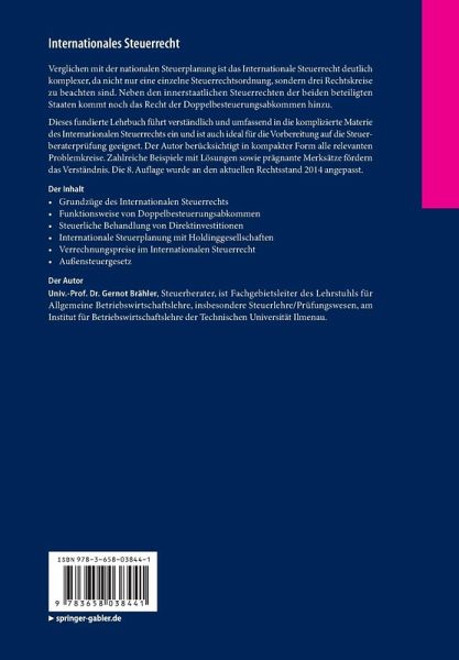 Dieses fundierte Lehrbuch führt verständlich und umfassend in die komplizierte Materie des Internationalen Steuerrechts ein und ist auch ideal für die Vorbereitung auf die Steuerberaterprüfung geeignet. Der Autor berücksichtigt in kompakter Form alle relevanten Problemkreise. Zahlreiche Beispiele mit Lösungen sowie prägnante Merksätze fördern das Verständnis. Die 8. Auflage wurde an den aktuellen Rechtsstand 2014 angepasst.