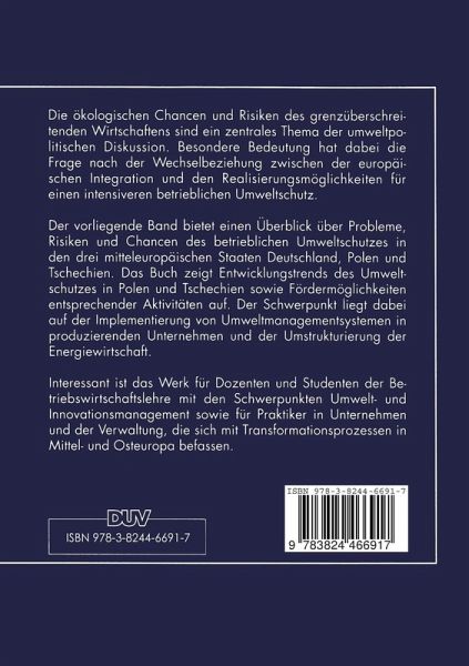 Die ökologischen Chancen und Risiken des grenzüberschreitenden Wirtschaftens sind ein zentrales Thema der umweltpolitischen Diskussion. Besondere Bedeutung hat dabei die Frage nach der Wechselbeziehung zwischen der europäischen Integration und den Realisierungsmöglichkeiten für einen intensiveren betrieblichen Umweltschutz. Dieser Band bietet einen Überblick über Probleme, Risiken und Chancen des betrieblichen Umweltschutzes in den drei mitteleuropäischen Staaten Deutschland, Polen und Tschechien. Das Buch zeigt Entwicklungstrends des Umweltschutzes in Polen und Tschechien sowie Fördermöglichkeiten entsprechender Aktivitäten auf. Der Schwerpunkt liegt dabei auf der Implementierung von Umweltmanagementsystemen in produzierenden Unternehmen und der Umstrukturierung der Energiewirtschaft.