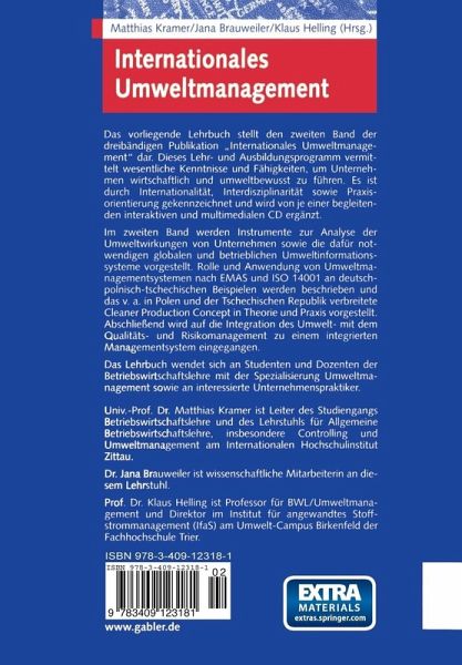 Das vorliegende Lehrbuch stellt den zweiten Band der dreibändigen Publikation "Internationales Umweltmanagement" dar. Dieses Lehr- und Ausbildungsprogramm vermittelt wesentliche Kenntnisse und Fähigkeiten, um Unternehmen wirtschaftlich und umweltorientiert zu führen. Es ist durch Internationalität, Interdisziplinarität sowie Praxisorientierung gekennzeichnet und wird von je einer begleitenden interaktiven und multimedialen CD ergänzt.