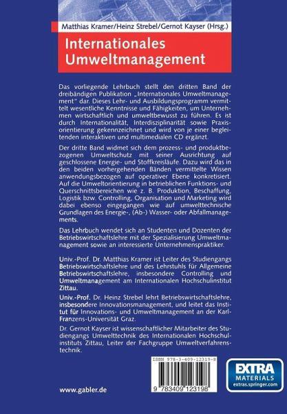 Das vorliegende Lehrbuch stellt den dritten Band der dreibändigen Publikation "Internationales Umweltmanagement" dar. Dieses Lehr- und Ausbildungsprogramm vermittelt wesentliche Kenntnisse und Fähigkeiten, um Unternehmen wirtschaftlich und umweltorientiert zu führen. Es ist durch Internationalität, Interdisziplinarität sowie Praxisorientierung gekennzeichnet und wird von je einer begleitenden interaktiven und multimedialen CD ergänzt.