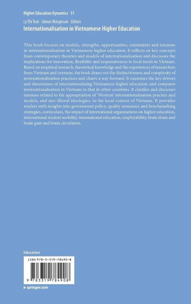 This book focuses on models, strengths, opportunities, constraints and tensions in internationalisation in Vietnamese higher education. It reflects on key concepts from contemporary theories and models of internationalisation and discusses the implications for innovation, flexibility and responsiveness to local needs in Vietnam. Based on empirical research, theoretical knowledge and the experiences of researchers from Vietnam and overseas, the book draws out the distinctiveness and complexity of internationalisation practices and charts a way forward. It examines the key drivers and dimensions of internationalising Vietnamese higher education, and compares internationalisation in Vietnam to that in other countries. It clarifies and discusses tensions related to the appropriation of 'Western' internationalisation practice and models, and neo-liberal ideologies, to the local context of Vietnam. It provides readers with insights into government policy, quality assurance and benchmarking strategies, curriculum, the impact of international organisations on higher education, international student mobility, transnational education, employability, brain drain and brain gain and brain circulation.