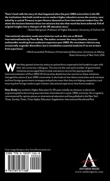 Preface; Prologue; 1. The Polytechnic Ideal Local, Equal to Universities But Different; 2. Becoming a 'Real' University Breaking of the Binary Divide, Weak Governance and Executive Salaries;3 Money Matters Post 1992 Universities Unequal Funding 4 UK Government Higher Education Internationalisation Policies Prime Ministers Initiative (PMI) Branding, Monetarisation and Commercialisation of Post 1992 Universities; 5 Prime Ministers Initiative for International Education PMI2; 6 Fresh Talent Initiative The Scottish Government Pulls a Fast One; 7 Bogus Colleges and Dodgy Diplomas The Effect of Student Visa Scams and Changes in the UK Public's Views on Immigration; 8 International Recruitment Fairs, Agents, British Council, Post 1992 Universities Hard Sell; 9 Internationalisation Economic Success of Post 1992 Universities Vs Tensions at Home. How Internationalised Are Post 1992 Universities; 10 Corruption Vs Cash High Risk Markets; 11 Malaysia Following the Ringitt, How Post 1992 Universities TNE Helped Malaysia and Propped up a Discriminatory HE System; 12. China Becoming Part of a Managed Economy Selling UK's Intellectual Property and Helping Chinese HE Becoming World Class; 13 USA Altruistic American Universities in the International Market; 14 QAA As Catalogers of UK Universities Collaborative Behaviour; 15. Conclusion Can Post 1992 Universities Become Both International and Local; Index.