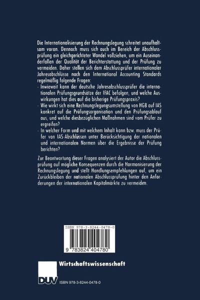 Die Internationalisierung der Rechnungslegung schreitet unaufhaltsam voran. Dennoch muss sich auch im Bereich der Abschlussprüfung ein gleichgerichteter Wandel vollziehen, um ein Auseinanderfallen der Qualität der Berichterstattung und der Prüfung zu vermeiden. Daher stellen sich dem Abschlussprüfer internationaler Jahresabschlüsse nach den International Accounting Standards regelmäßig folgende Fragen: - Inwieweit kann der deutsche Jahresabschlussprüfer die internationalen Prüfungsgrundsätze der IFAC befolgen, und welche Auswirkungen hat dies auf die bisherige Prüfungspraxis? - Wie wirkt sich eine Rechnungslegungsumstellung von HGB auf IAS konkret auf die Prüfungsorganisation und den Prüfungsablauf aus, und welche diesbezüglichen Maßnahmen sind vom Prüfer zu ergreifen? - In welcher Form und mit welchem Inhalt kann bzw. muss der Prüfer von IAS-Abschlüssen unter Berücksichtigung der nationalen und internationalen Normen über die Ergebnisse der Prüfung berichten? Zur Beantwortung dieser Fragen analysiert der Autor die Abschlussprüfung auf mögliche Konsequenzen durch die Harmonisierung der Rechnungslegung und stellt Handlungsempfehlungen auf, um ein Zurückbleiben der nationalen Abschlussprüfung hinter den Anforderungen der internationalen Kapitalmärkte zu vermeiden.
