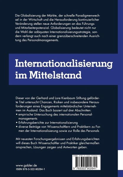 Die Globalisierung der Märkte, der schnelle Paradigmenwechsel in der Wirtschaft, die Herausforderung kontinuierlicher Veränderung und die erhöhte Bedeutung von Führungs- und Mitarbeiterpotential setzen weltweit neue Rahmenbedingungen für unternehmerisches Handeln. Die Gerhard und Lore Kienbaum Stiftung hat deshalb das Forschungsprojekt "Auslandsorientierung der deutschen Wirtschaft - Erfolgsfaktor Personal" ins Leben gerufen. Das daraus hervorgegangene Buch setzt sich in drei Teilen mit verschiedenen Wegen des Auslandsengagements deutscher Unternehmen auseinander. Der erste Teil besteht aus einer empirischen Studie, die von einem Team der Universität Paderborn unter Leitung von Dr. Rüdiger Kabst erstellt wurde. Im zweiten Teil des Buches kommen Unternehmen zu Wort, die von ihren Erfahrungen mit Auslandsengagements berichten. Der letzte Teil umfasst Beiträge von angesehenen Experten deutscher und internationaler Hochschulen und Beratungsunternehmen.