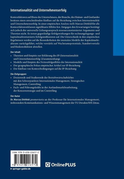 Kontextfaktoren auf Ebene des Unternehmens, der Branche, des Heimat- und Gastlandes besitzen einen entscheidenden Einfluss auf die Beziehung zwischen Internationalität und Unternehmenserfolg. In einer empirischen Analyse stellt Marcus Dittfeld für alle Kontextfaktorenklassen signifikante Effekte fest. Entgegen den Erwartungen bestätigt sich jedoch der universelle Geltungsanspruch ressourcenorientierter Argumente und Theorien nicht. Es treten gegenläufige Erfolgswirkungen für rechnungslegungs- und kapitalmarktorientierte Erfolgsindikatoren auf. Die Unterschiede in den empirischen Ergebnissen werden auf die Besonderheiten der mentalen Modelle der Kapitalmarktakteure zurückgeführt, welche verstärkt auf Wachstumspotentiale, Standortvorteile und Risikoreduktion abstellen.