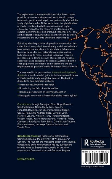 Introduction. Daya Kishan Thussu. Part I. Internationalizing Media Research 1. Why Internationalize Media Studies and How? 2. What Should Comparative Media Research Be Comparing? Towards a Transcultural Approach to 'Media Cultures' 3. Globalization Theories and Media Internationalization: A Critical Appraisal 4. Frames for Internationalizing Media Research 5. Media and Communication Studies Going Global. Part II. Broadening the Field of Media Studies 6. Globalizing Media Law and Policy 7. Changing Paradigms of Media Research and Practice in Contexts of Globalization and Terror 8. Comparative Media Law and Policy: Opportunities and Challenges 9. The Labouring of International Communication. Part III. Regional Perspectives on Internationalization 10. Asian Media Studies: The Struggle for International Legitimacy 11. Rethinking Chinese Media Studies: History, Political Economy and Culture 12. Media and Cultural Studies in the Arab World: Making Bridges to Local Discourses of Modernity 13. De-Sovietizing Russian Media Studies 14. Citizens' Media as Political Subjects: Case of Community Radio in Colombia. Part IV. Pedagogic Parameters: Internationalizing Media Syllabi 15. Internationalizing Media Ethics Studies 16. Media Studies as an Academic Discipline 17. International Media Studies in the US Academy: A Sampling of Programmes and Textbooks 18. Re-Conceptualizing Media Studies in Africa 19. The Internationalization of the Internet and its Implications for Media Studies.